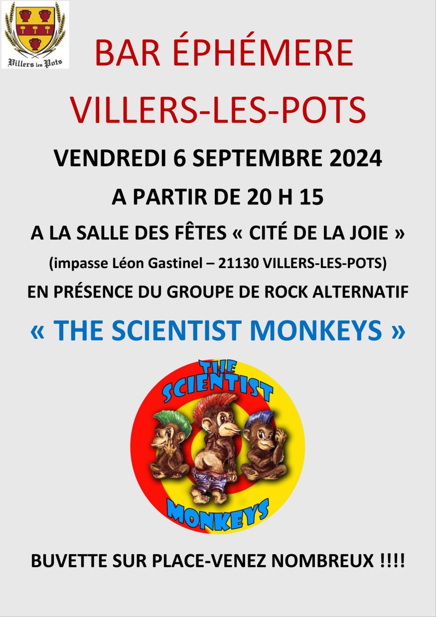 La commune de VIllers les pots vous invite au dernier bar éphémère de la saison le vendredi 6 septembre à à partir de 20h15 à la salle des fêtes la cité de la joie en présence de scientist monkeys rock alternatif
