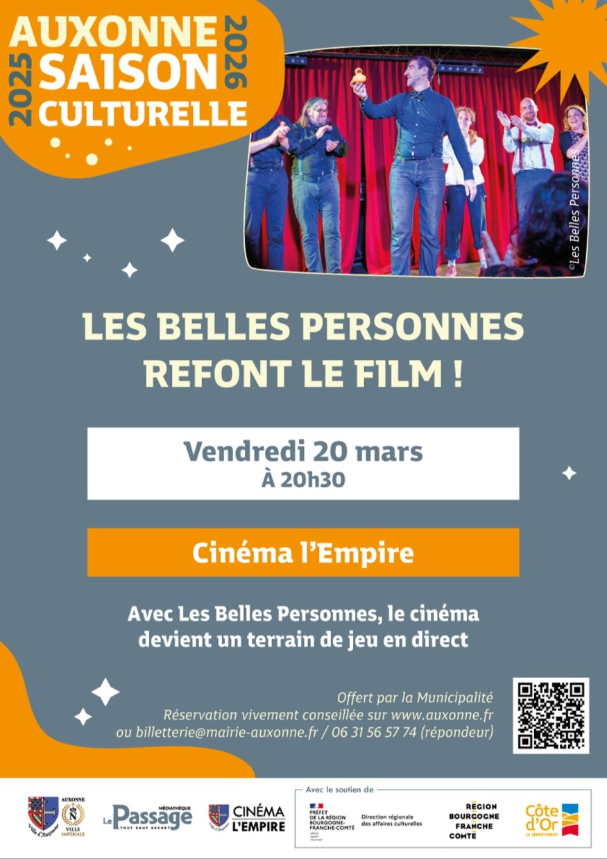 La troupe « Les Belles Personnes » vous propose de « refaire le film » en improvisant des scènes de films cultes, choisies par le public. Résultat : fous rires et détournements garantis, aucun spectacle ne se ressemble !