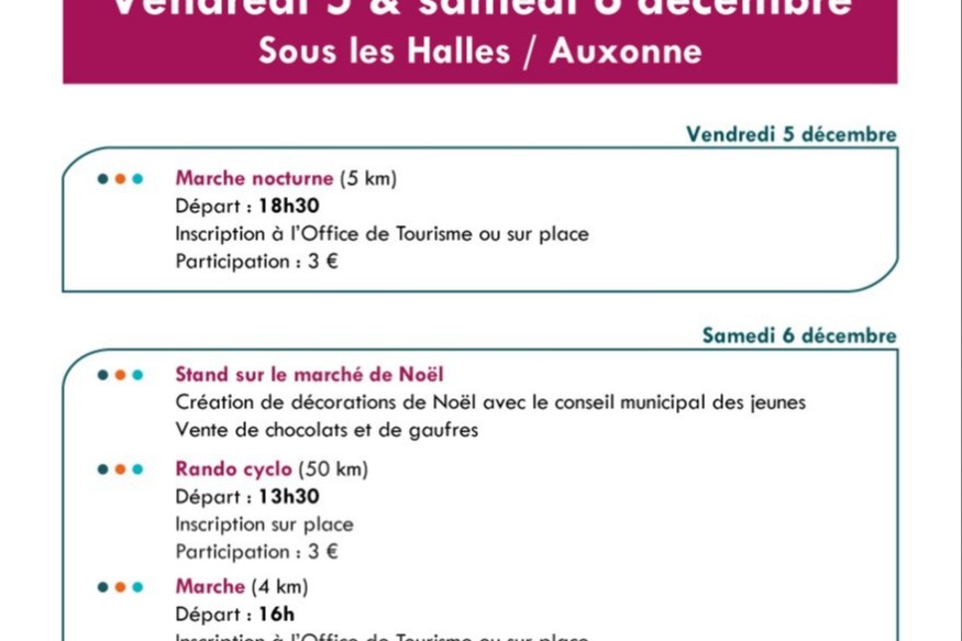 Soyez solidaires pour le Téléthon à Auxonne les 5 et 6 décembre ! Vendredi, participez à la marche nocturne de 5 km. Samedi, au choix : rando cyclo à 13h30 ou marche de 4 km à 16h. Et tout le ...