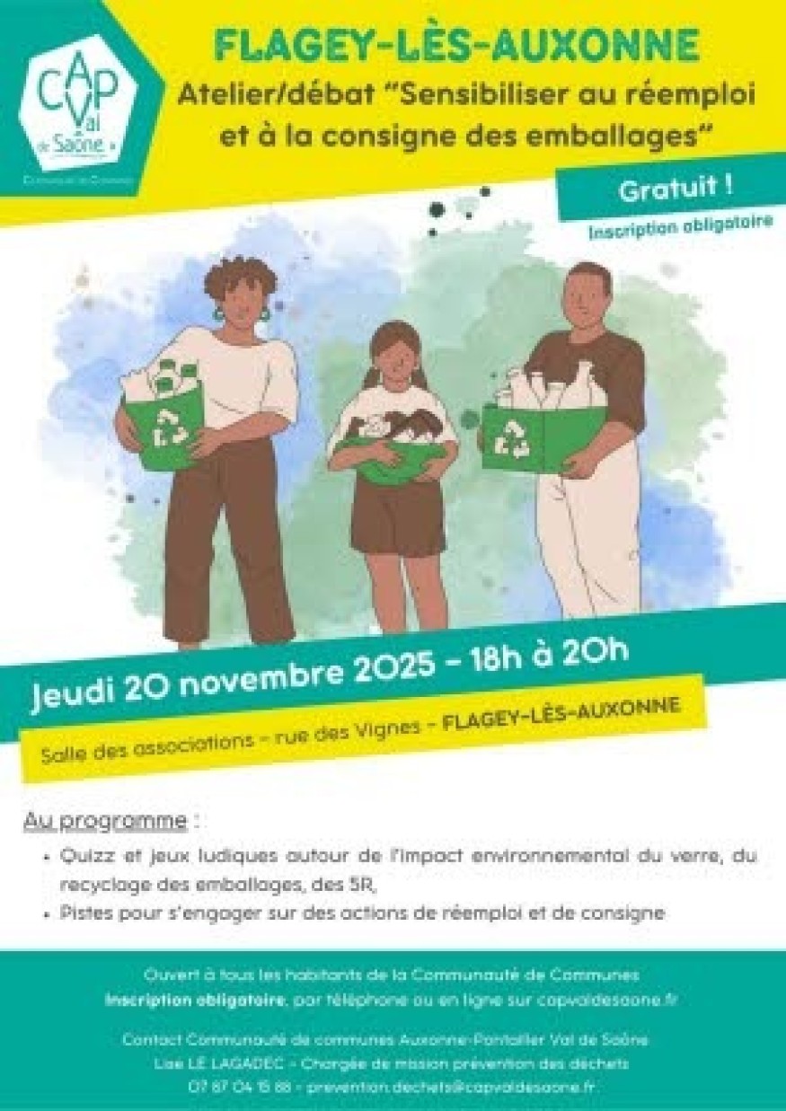 Du 20 novembre 2025, ne manquez pas l'atelier-débat "Sensibiliser au réemploi et à la consigne des emballages" ! Rendez-vous de 18h à 20h à la salle des associations, rue des Vignes à Flagey-lès-Auxonne.