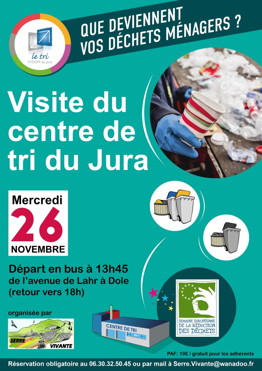 Mercredi 26 novembre, découvrez le parcours de vos déchets lors d'une visite guidée du centre de tri du SYDOM du Jura. Organisée par Serre Vivante, cette sortie comprend le transport au départ de Dole à 13h45 et dure environ 2h. Places limitées, réservation obligatoire au 06 30 32 50 45. Tarif : 10€.