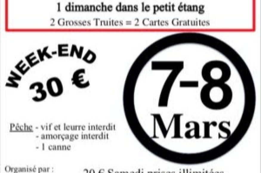 Samedi 7 et dimanche 8 mars, l'association de pêche "Le Bas Sauvage" organise son Safari Truites à l'étang de Trouhans. Samedi : pêche illimitée dans le grand étang, 20€. Dimanche : pêche lim...