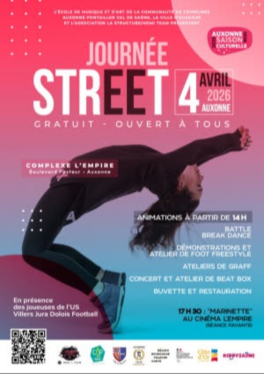 Samedi 4 avril à partir de 14h, le complexe l'Empire d'Auxonne organise une Journée Street dédiée à la culture urbaine. Au programme : battle de breakdance, foot freestyle, ateliers de graff avec Kawa, concert et atelier de beatbox avec Noun, vice-championne de France 2025. Projection du film "Marinette" à 17h30 au cinéma (tarifs habituels). Buvette et petite restauration. Entrée libre pour les animations.