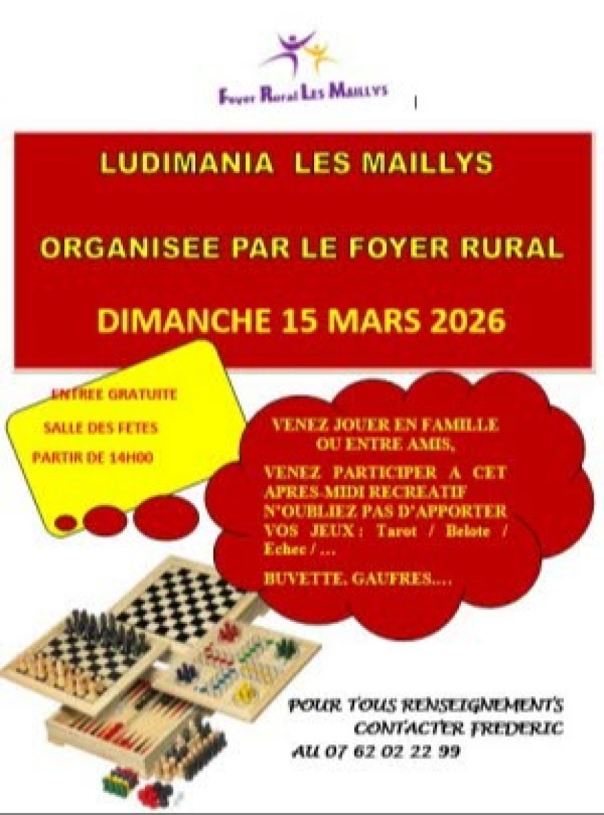 Rendez-vous le dimanche 15 mars à partir de 14h, à la salle des fêtes des Maillys. Apportez vos jeux préférés : cartes, tarot, échecs, jeux de société... et partagez un moment convivial en famille ou entre amis. Une buvette et des gaufres vous attendront sur place.