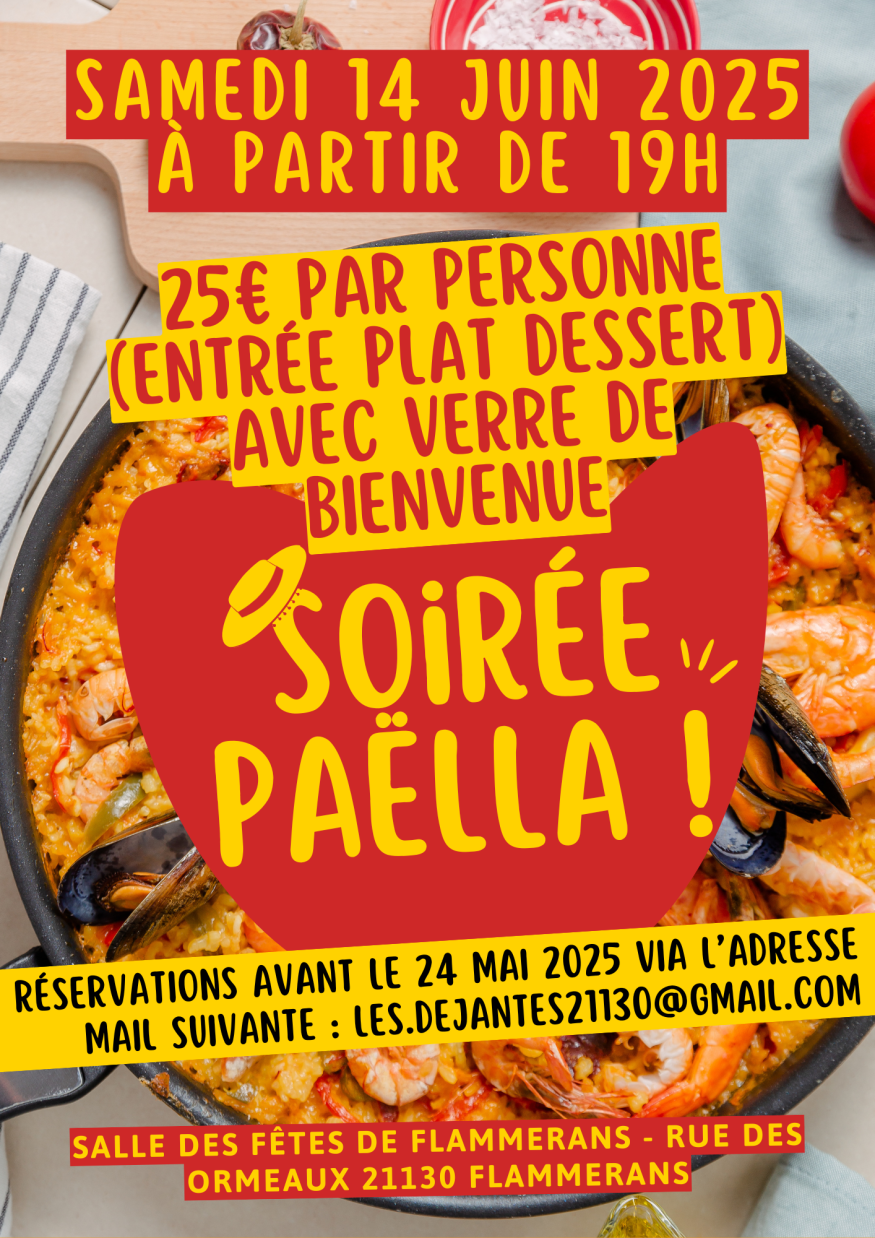 Le Club de carnaval "Les Déjantés" organise une soirée paella le samedi 14 Juin 2025 à partir de 19h00 à la salle des fêtes de Flammerans.